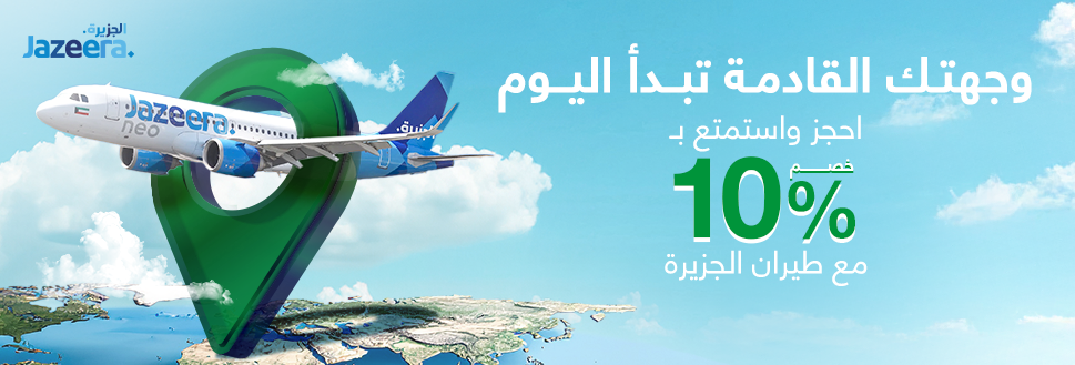 خصم 10% عند حجز تذكرة ذهاب فقط أو ذهاب وعودة على أي درجة من الكويت إلى جميع الوجهات.