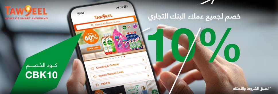 - خصم 10% على جميع الفئات باستثناء: الالكترونيات، البطاقات الإلكترونية، التبغ، محلات Taw9eel مول
